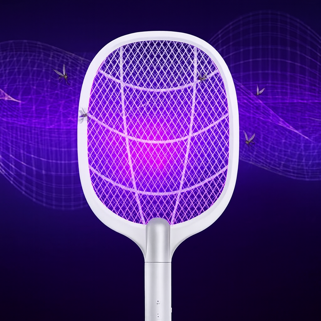 Diga adeus aos mosquitos e insetos de forma rápida e segura com a Raquete Elétrica Mata Insetos Recarregável com Base e Luz LED.