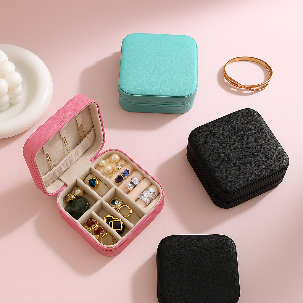 Mantenha suas joias seguras e bem organizadas com o Porta-Joias de Viagem Compacto.